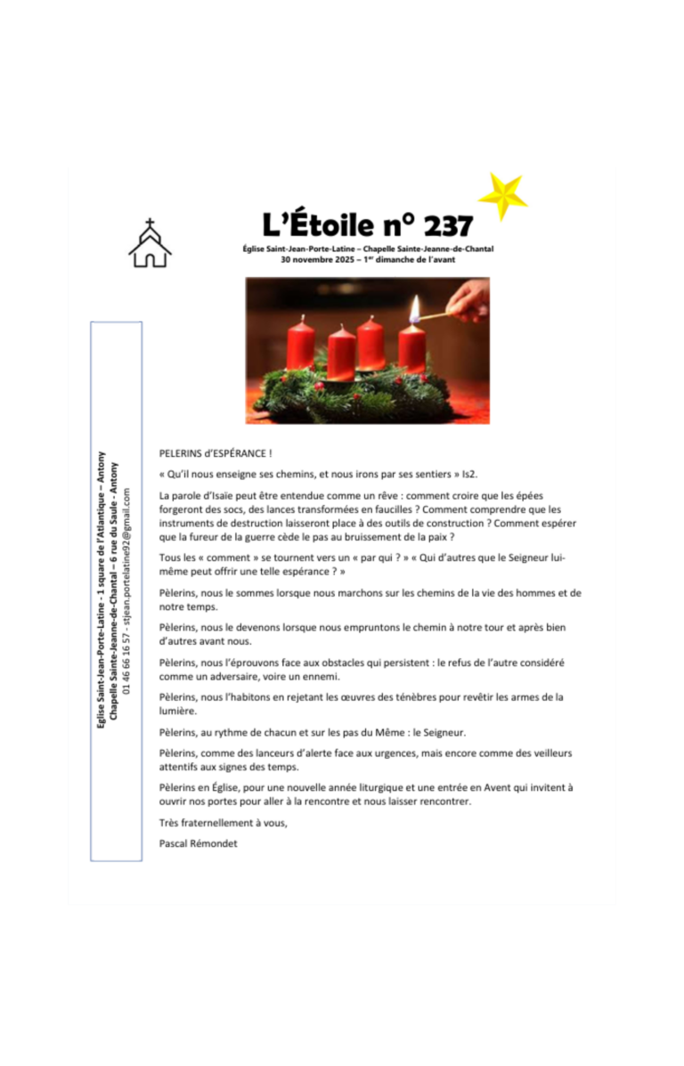 Feuilles Paroissiales 2025 GénéralL’étoile 237 30 novembre – Pèlerins d’espérance L’étoile 237 > Lire plus