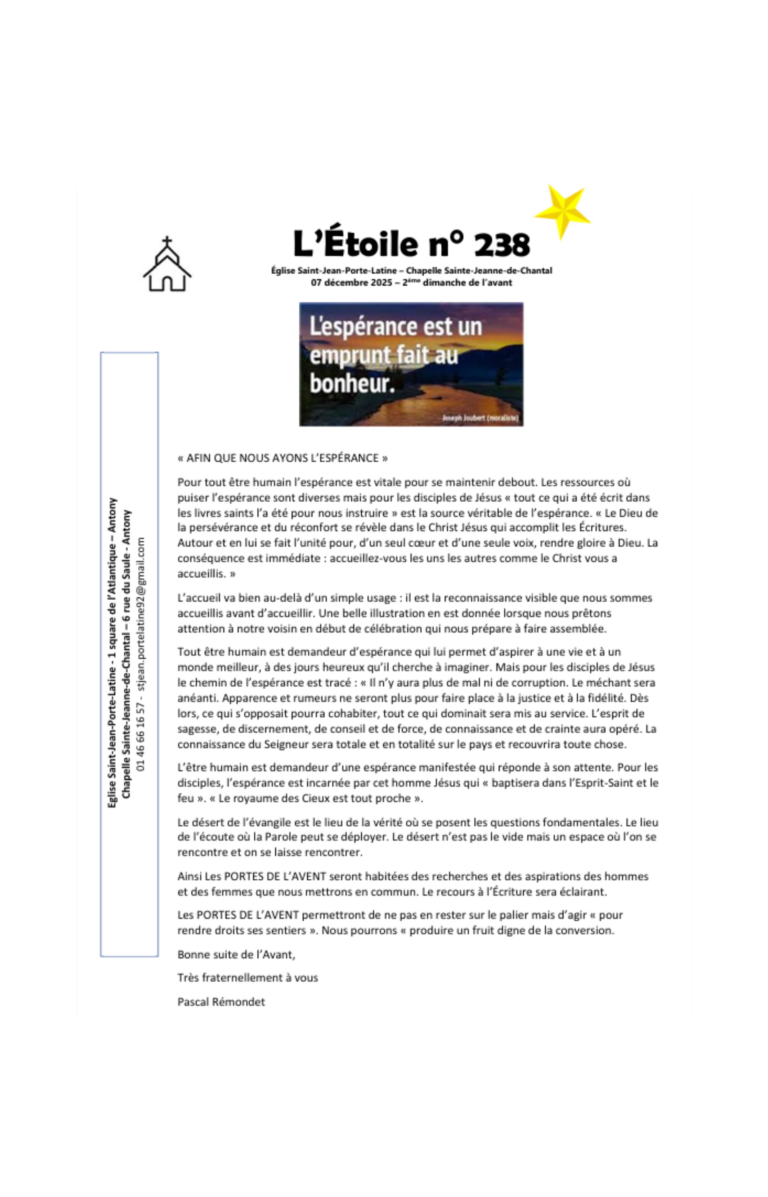 Feuilles Paroissiales 2025 GénéralL’étoile 238 7 décembre – Afin que nous ayons l’espérance L’étoile 238 > Lire plus