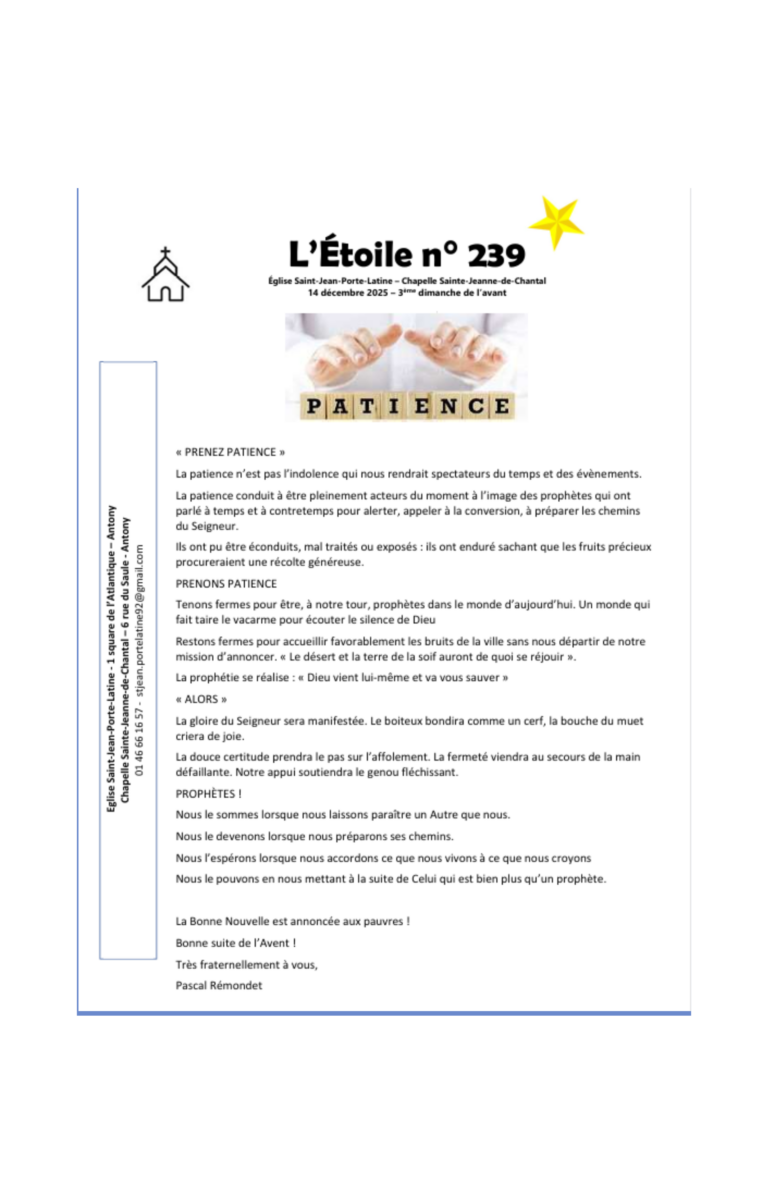 Feuilles Paroissiales 2025 GénéralL’étoile 239 114 décembre – Prenez patience L’étoile 239 > Lire plus