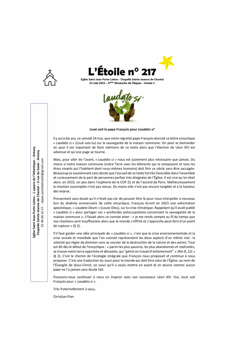 Feuilles Paroissiales 2025 GénéralL’étoile 217 25 Mai 2025 – Loué soit le pape François pour […] L’étoile 217 > Lire plus