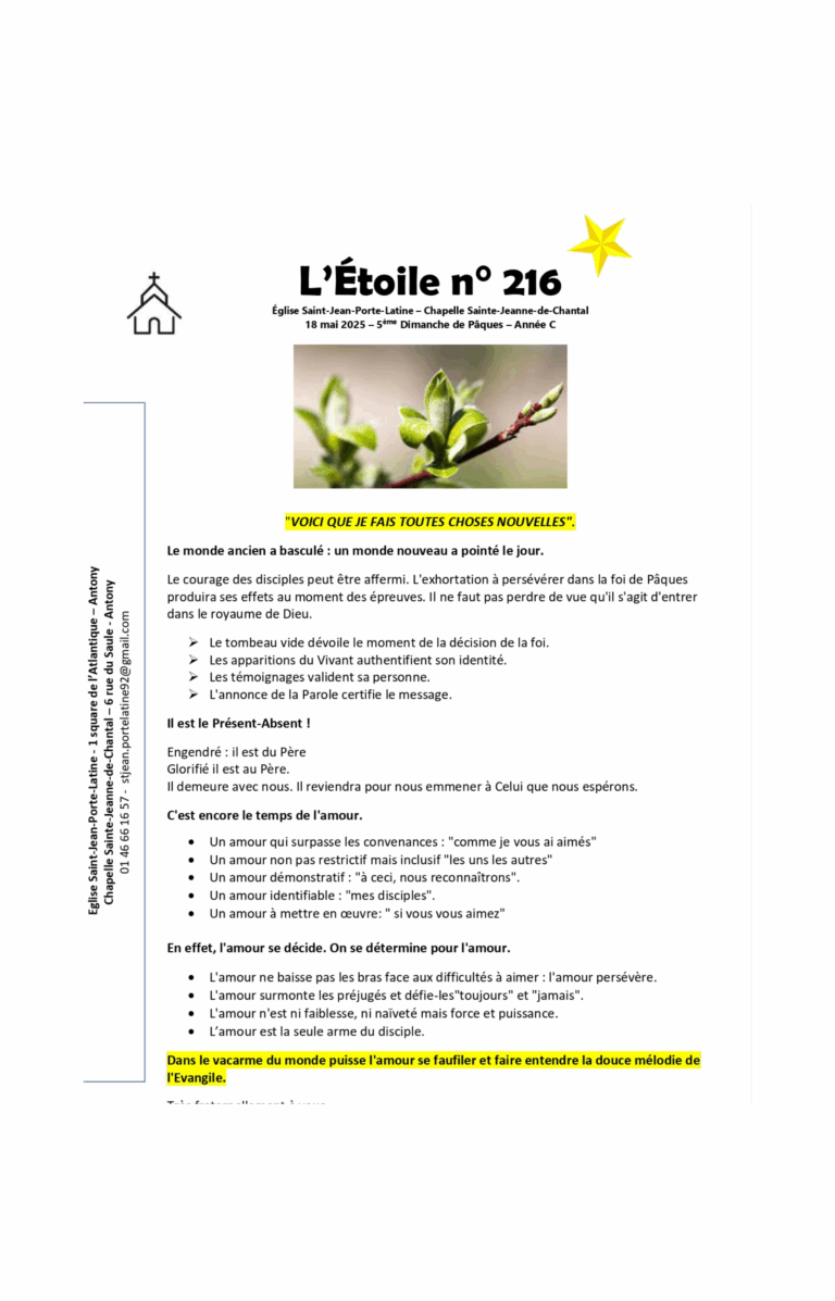 Feuilles Paroissiales 2025 GénéralL’étoile 216 18 mai 2025 – « Voici que je fais toutes choses L’étoile 216 > Lire plus